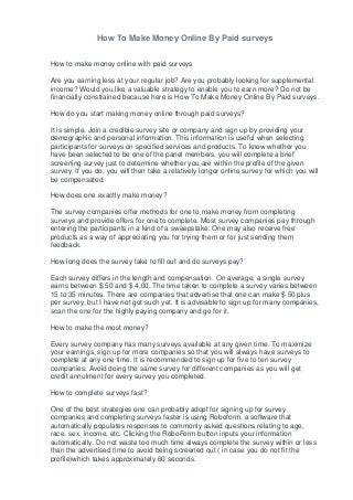 It may not enable you to generate as much income as you possibly can do in other Internet-based alternatives, nevertheless it certainly is price your time. Since you’ll be paying them, they might care regarding the nice quality within the list they offer you. Aside from these, the persons may additionally get viruses on their computer systems. Plus, it wouldn't simply be these ads, it's also possible to get money from sponsorships or even your personal merch! Her book aims to get you into print, not necessarily to get you rich. Under, you will find all the most effective on-line surveys for cash in Australia opinions. The way to earn cash without investment? You do not must be technically skillful or knowledgeable so as to discover ways to make money with Fb apps. It is best to notice that you will have to do the work and that this is not an automatic system that earns cash for you whilst you do other things.